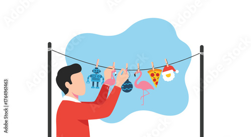 Whimsical laundry line of fun hanging ornaments including robots, flamingos, and pizza slices bringing joy to quirky holiday celebrations and creative DIY projects, perfect for unique invitations
