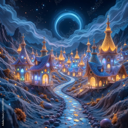 Whimsical Neon Beaded Fairy-Tale House with Volumetric Fractal Textures and Iridescent Crystals