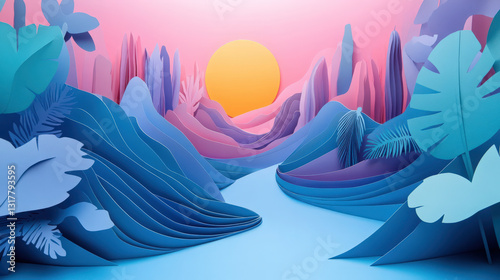 Whimsical paper cut landscape illustration features tropical plants and a warm, setting sun. For Whimsical social media graphics.