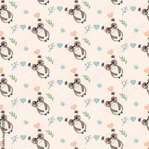 Whimsical Pattern of Cute Pandas, Hearts, and Flowers on Beige Background