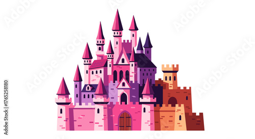 Whimsical Pink Castle Fortress Against White Backdrop, Fantasy Architecture, Enchanted Kingdom Illustration for Children's Storybooks, Fairy Tale Animated Movies, Princess Party Invitations, Digital M