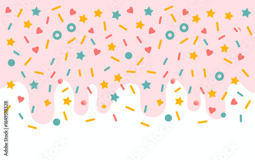 Whimsical pink frosting with colorful sprinkles including stars hearts circles and rods creating a festive celebratory background