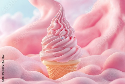 Whimsical Pink Ice Cream Cone on Cotton Candy Background