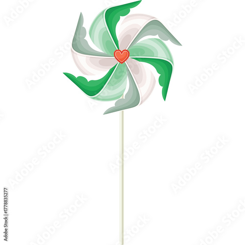 Whimsical Pinwheel Toy With Green White and Pink Petals and a Red Heart Center on a Transparent Background