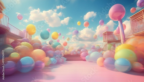 whimsical playground filled with oversized translucent rainbowcolored balls of varying sizes floating in a dreamlike pastel sky with soft clouds