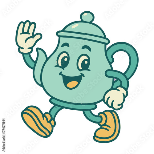 Whimsical retro teapot character with a cheerful wave and energetic stride, bringing a touch of nostalgic fun and playful charm to any project
