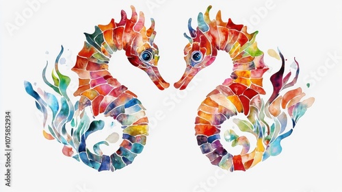 Whimsical seahorses, stained glass style, watercolor clipart in the center on plain solid white background, high resolution, 8k, high quality, clean appearance