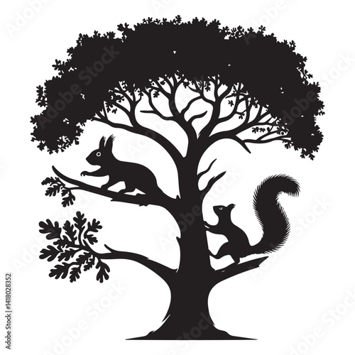 Whimsical Silhouette Illustration of a Tree with Two Squirrels