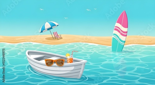 Whimsical summer-themed vector illustration of a white boat floating on calm light blue water with darker ripples.