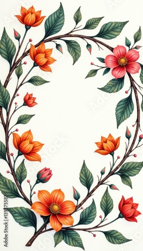 Whimsical swirl of calligraphic flowers, leaves, and branches in a circular pattern, floral arrangements, bohemian decor