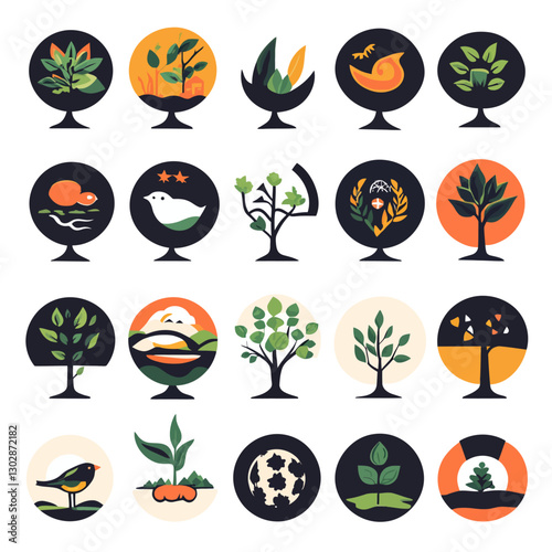 Whimsical Tree Icon Set: Nature, Conservation, and Growth Symbols