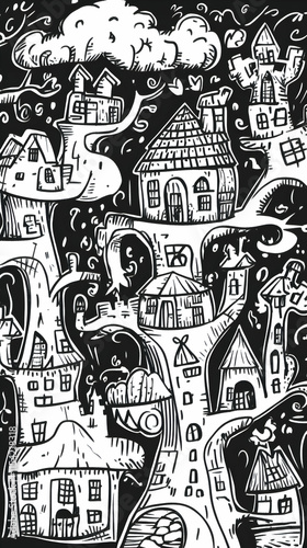 Whimsical treetop village illustration, fantasy houses, night sky background, children's book.