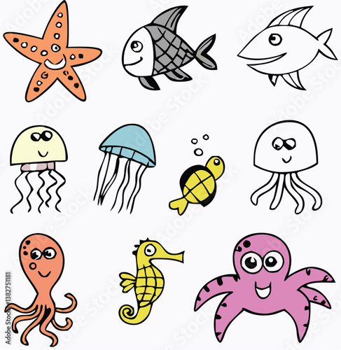 Whimsical Underwater World with Cute Mermaid, Playful Sea Creatures, and Vibrant Ocean Life – Colorful Cartoon Marine Illustration with Fish, Coral, and Starfish | colorful Sea Design.