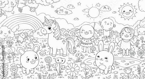 Whimsical Unicorn and Friends Coloring Page Magical Rainbow Meadow