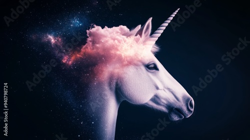Whimsical unicorn with a vibrant rainbow mane, stars scattered around in a double exposure effect with a mystical night sky