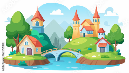 Whimsical Village Scene with Castle Towers Orange Roof Houses Green Hills and Blue River on White Background