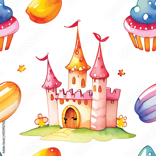 Whimsical Watercolor Castle Seamless Pattern For Childrens Decor A Delightful Repeat Illustration Featuring A Pink And Orange Castle With Cupcakes And Candies Perfect For Backgrounds And Creative