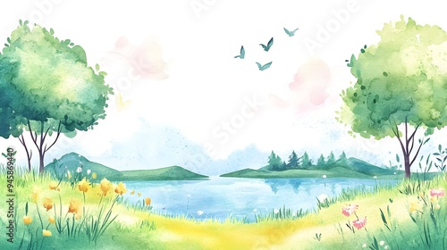 Whimsical Watercolor Landscape with Lake and Trees in Cartoon-Style Nature
