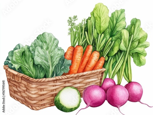 Whimsical watercolor of a wicker basket overflowing with a vibrant selection of fresh vegetables including carrots radishes and leafy greens