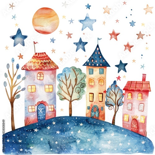 Whimsical Watercolor Townscape with Cozy Houses, Streetlights, and Magical Floral Patterns. Ideal for Print, Textile, and Scrapbooking Projects