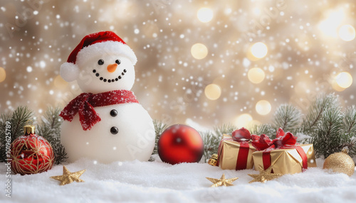 Whimsical winter holiday scene with trees, snowman, ornaments, and gifts