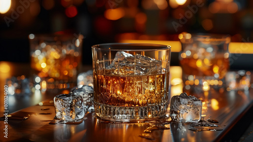 Whiskey alcohol drink bar ice liquid table glass, AI Generative.