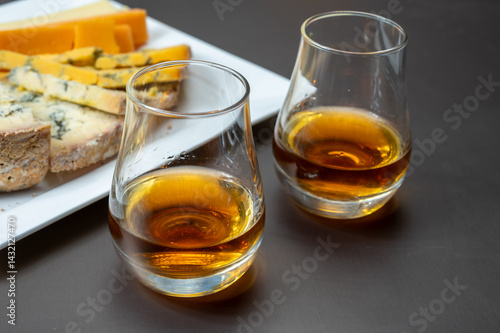 Whiskey and cheese pairing, tasting speyside whisky glasses and plate with sliced cheddar, blue stilton and blue shropshire cheeses, Great Britain food and drink