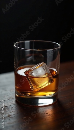 Whiskey glass on a dark wooden table with a single ice cube, beverage, background, whiskey