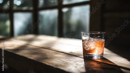 Whiskey glass with ice cubes on rustic table in natural sunlight