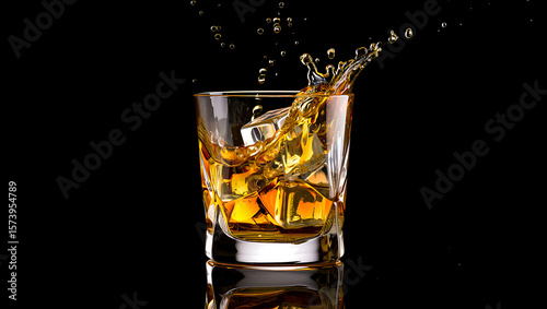 Whiskey Splash: Golden Amber Liquor in Rocks Glass with Ice, Dramatic Black Background, Luxurious Feel.