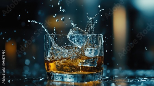 Whiskey splashes as ice cubes create dynamic ripples in a glass, illuminated against a moody dark background.