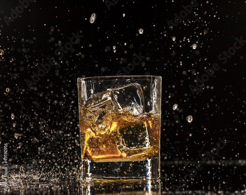 Whiskey splashing around glass, isolated on black background