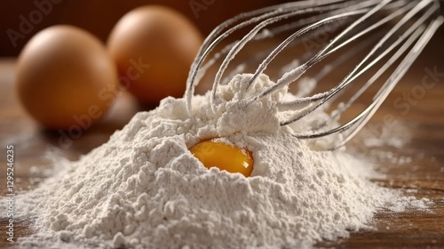 Whisking egg into flour; two eggs, flour pile, whisk; kitchen preparation