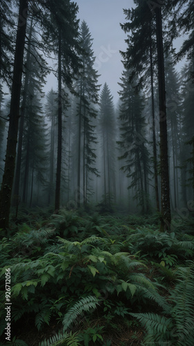 Whispering Pines: A Misty Morning Among Towering Trees and Lush Ferns
