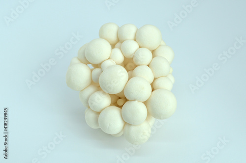 white shimeji mushroom on light blue background