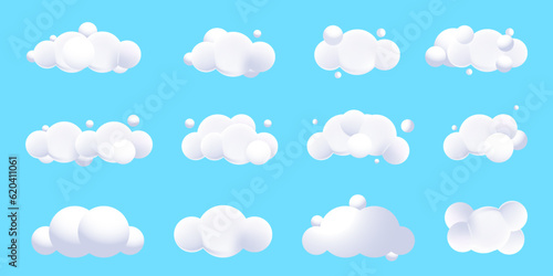 White 3d clouds set isolated on blue background. Rendering of soft round cartoon fluffy cloud icon on blue sky.