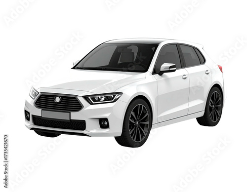 White 5-door hatchback car, sleek design, dark wheels, isolated on black background
