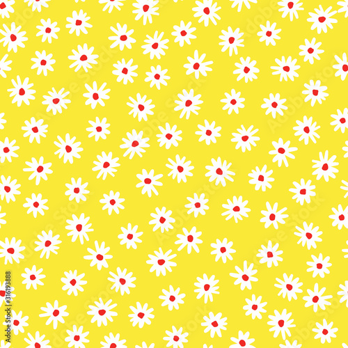 White abstract naive hand-drawn daisy flowers on yellow background vector seamless pattern