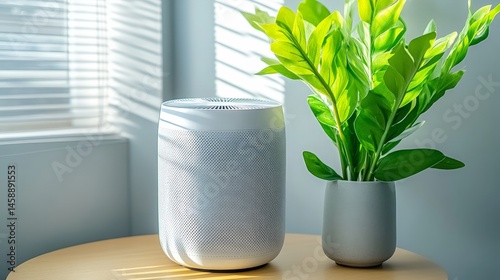 White Air Purifier on a Table with Green Plants in a Sunlit Room for Clean Air and Healthy Living