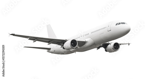 White Airplane Passenger Jet Airliner corner front view in Flight Featuring Two Underslung Engines and Clean Streamlined Wing Profile Isolated on a Transparent Background