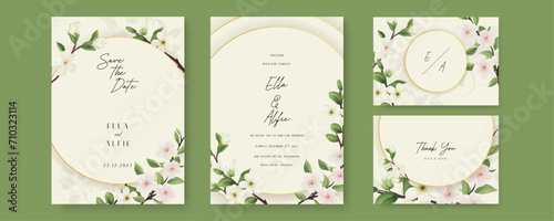 White and beige sakura and cosmos wedding invitation card template with flower and floral watercolor texture vector