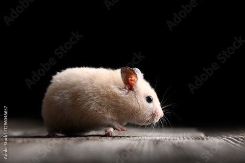 White and beige Syrian hamster on wooden table on black background