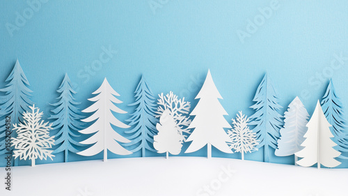 White and blue paper cut mixed trees standing in snowy winter forest, handmade Christmas background