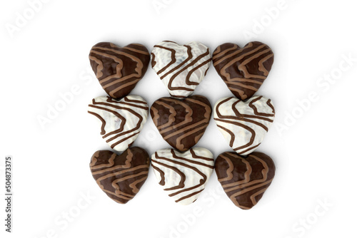 White and brown gingerbread cookies in heart shape isolated on white background.