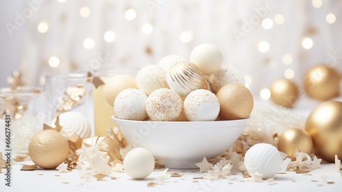 White and gold colored luxury elegantly bonbons at Christmas with cozy blur light background