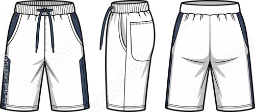 White and navy athletic shorts, drawstring waistband, side and back pockets, relaxed fit, three view display, casual sportswear fashion