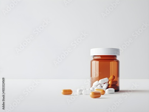 White and Orange Pills Spilled from Amber Bottle on White Background