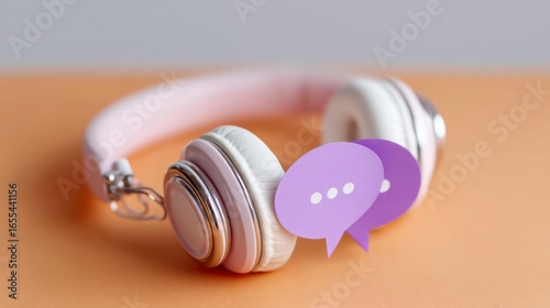 White and pink headphones adorned with purple speech bubbles on a peach colored surface