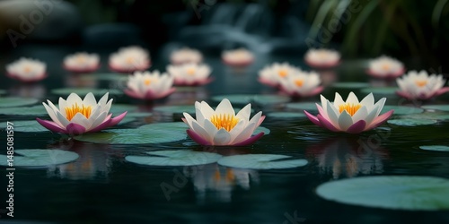 White and pink water lilies floating on a calm pond