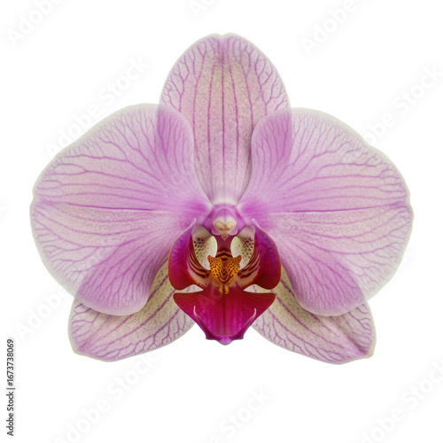 White and purple striped orchid isolated on white background, exotic tropical petals with elegant pattern, clean botanical composition.